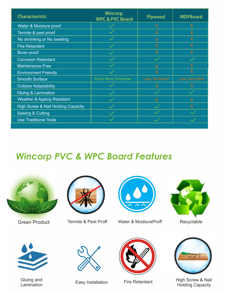 WPC & PVC(Polyvinyl Chloride) are not susceptible to rot caused by humid conditions, thus making them easier to maintain. You can pay according to your taste. No warping, doesn't crack nor slit, anti-bactirial, anti-fungus and anti-ageing properties can be achieved and gives a flawless and elegant look for a perfect modern living. Wincorp is here to make your life beautiful and modern.